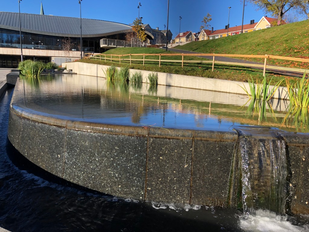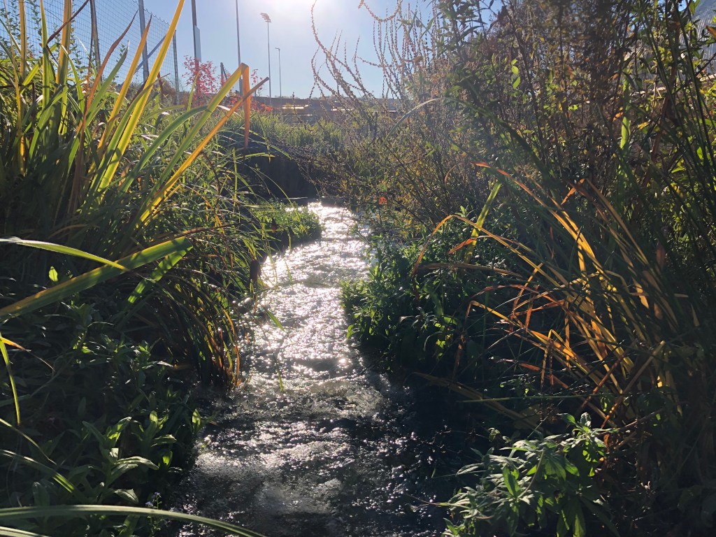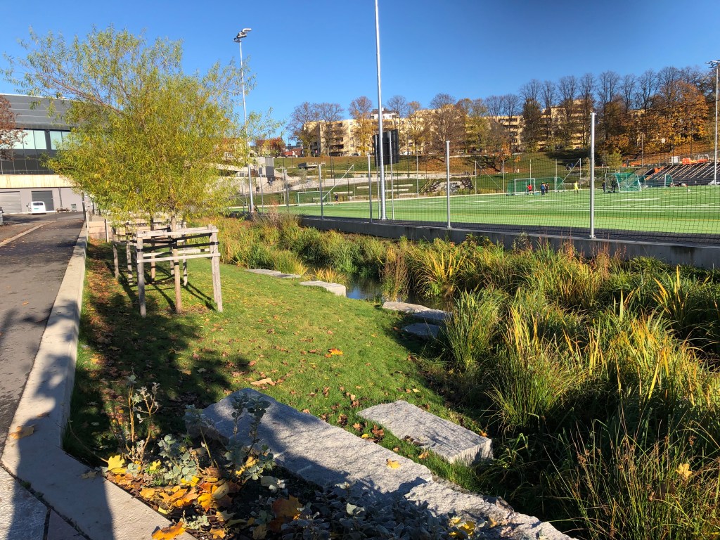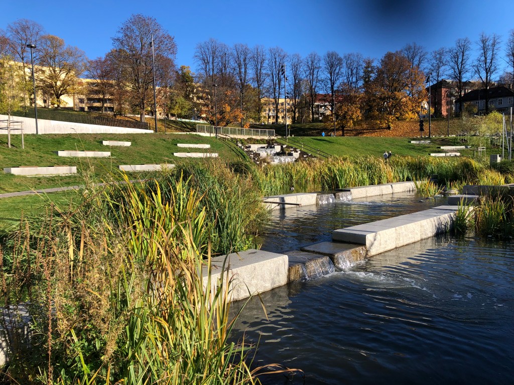 Anleggsgjerdene er borte. Parkanlegg med bekkeløp er rikt beplantet. Det vokser til. Et rikt utvalg piletrær er nå et vakkert følge langs Hovinbekken.