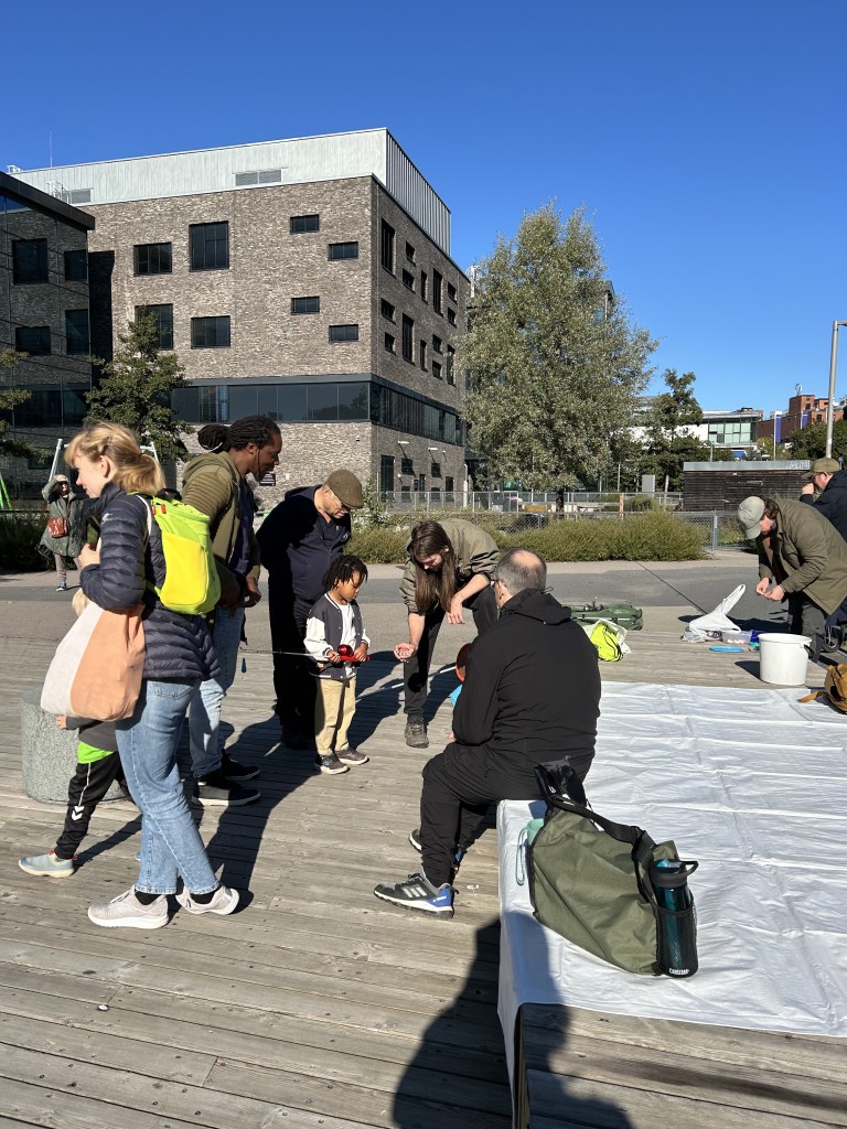 Arin Borgen fra Oslo Elveforum fanget bunndyr og viste fram livet i elva og dammen til barna som sto i kø for å få ledige fiskestenger. I løpet av dagen fikk både voksne og barn se levende gråsuger, hundeigler, ostrakoder, flatorm, damsnegler, døgnfluelarver, vårflularver, fjermygglarver, stikkmygglarver og øyenstikkerlarver.