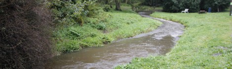 Mens vannføringen gjennom Bjerkedalen er regulert, var bekken nedstrøms breddfull av brunt flomvann. Her gjennom Graneren, fra Nordalveien videre til Rabbeveien, på Risløkka.